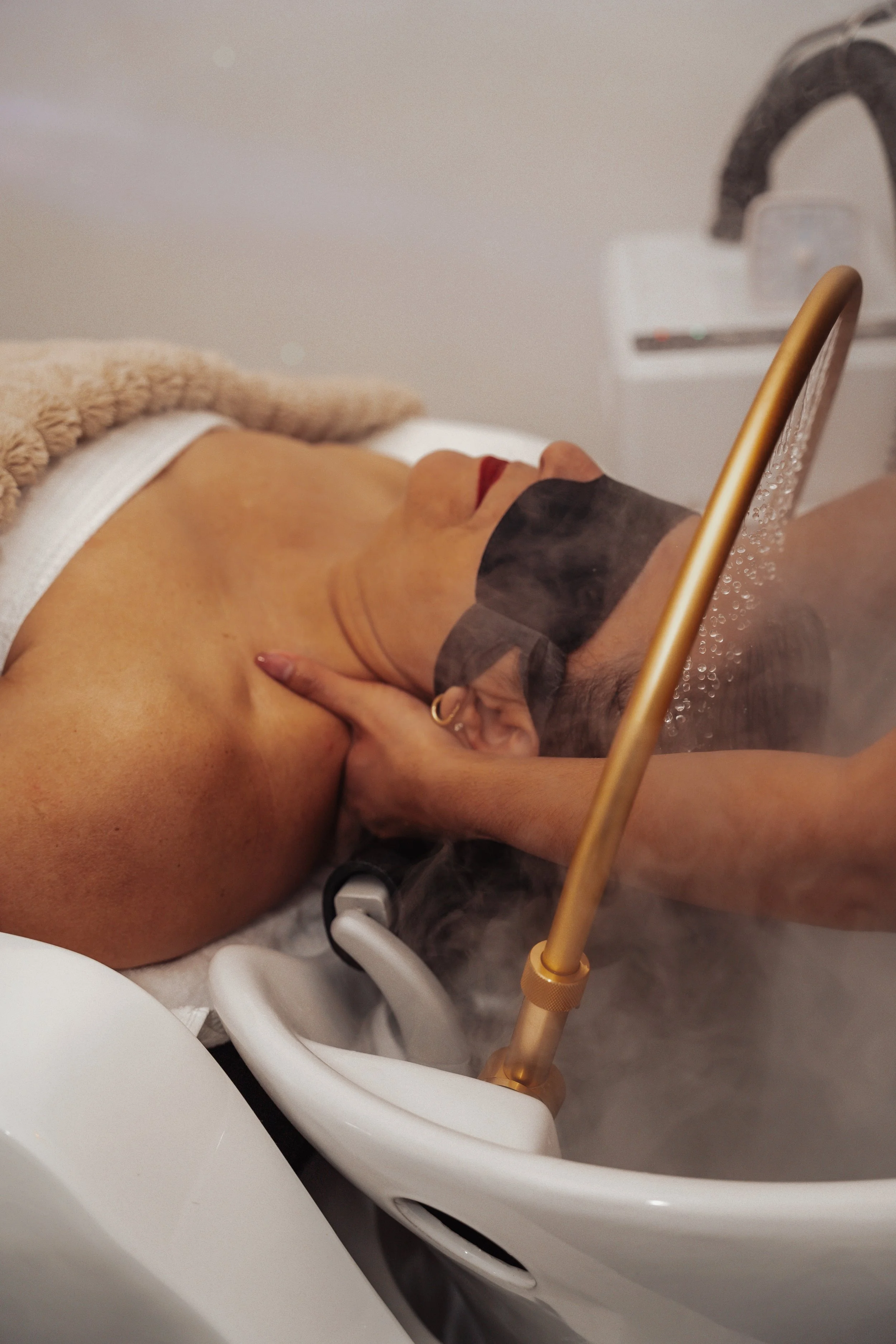 Halo Water Therapy, Detoxifying Cleansing, Targeted Scalp Treatment, Upper Body Massage, Hair Mask & Steam Treatment, Leave-In Conditioner & Rough Dry.